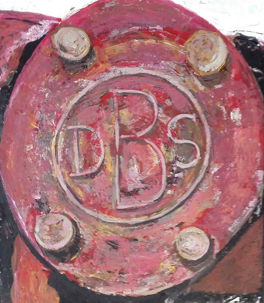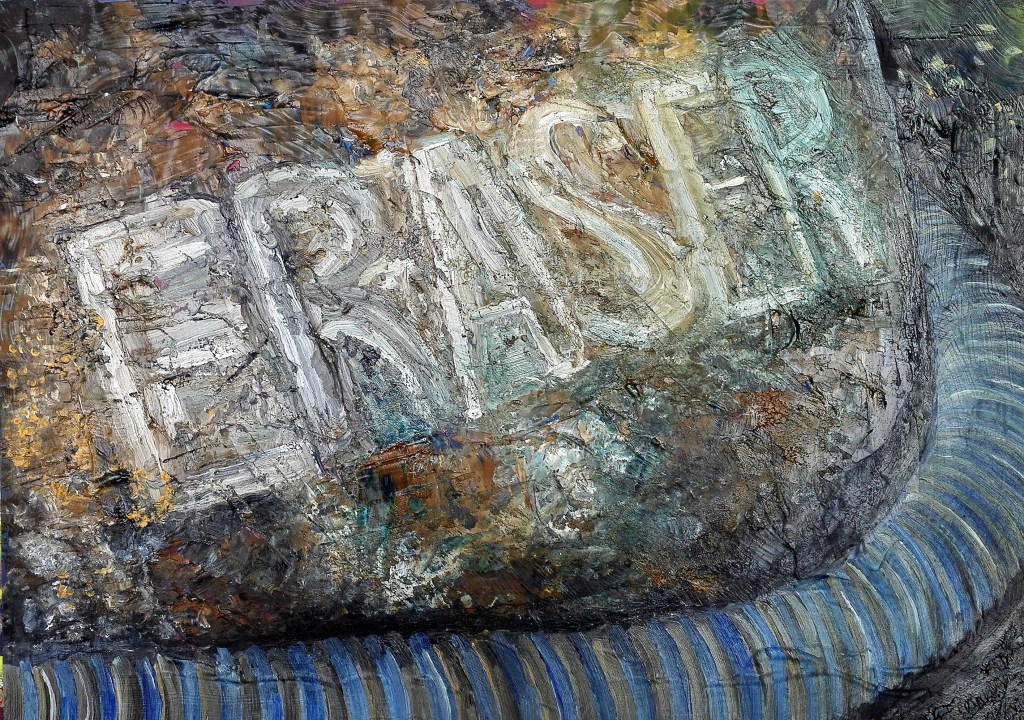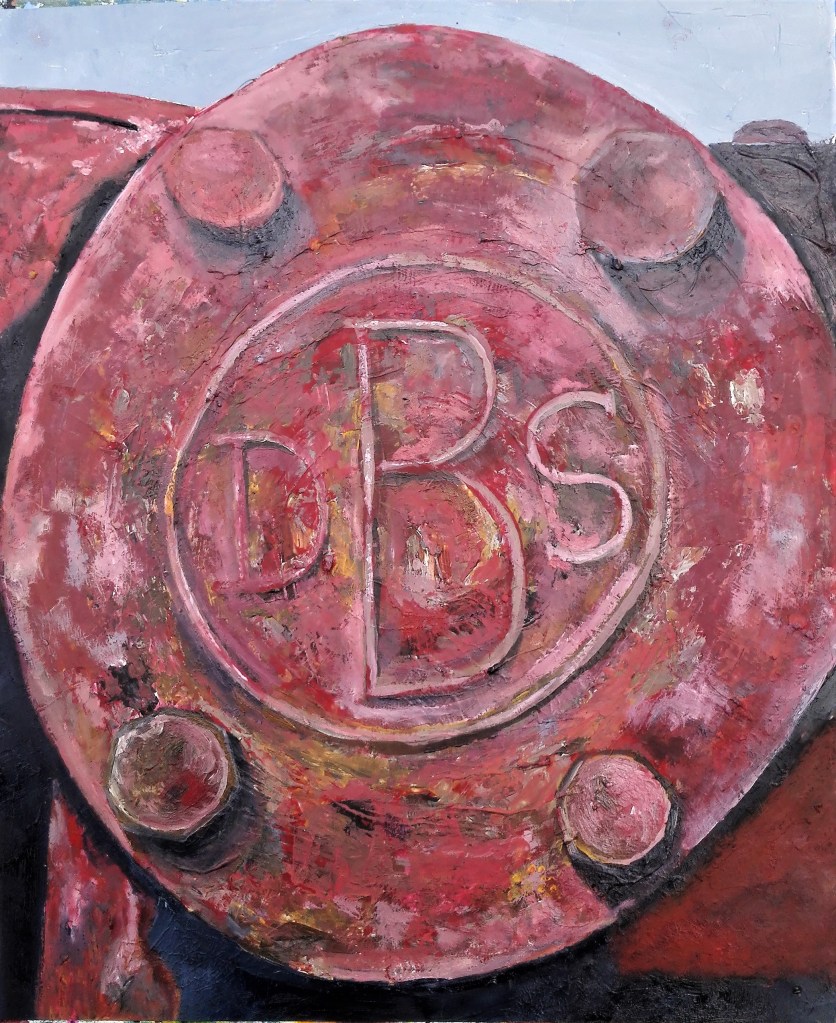 For this painting I return to the old pump and this time focused on a close-up of the name plate. I was drawn to this image for two reasons. The dulled red colours, obviously faded by years of sunlight, and how they contrasted and complimented the brown rust and dark shadows. The composition was rather obvious being a circular in a rectangle. I felt that it worked. For the first time in this series I would introduce Aqua oils to the painting mediums. The underpainting was in acrylics as these adhere well to the acetate support and provide an excellent surface to apply the Aqua oil to.