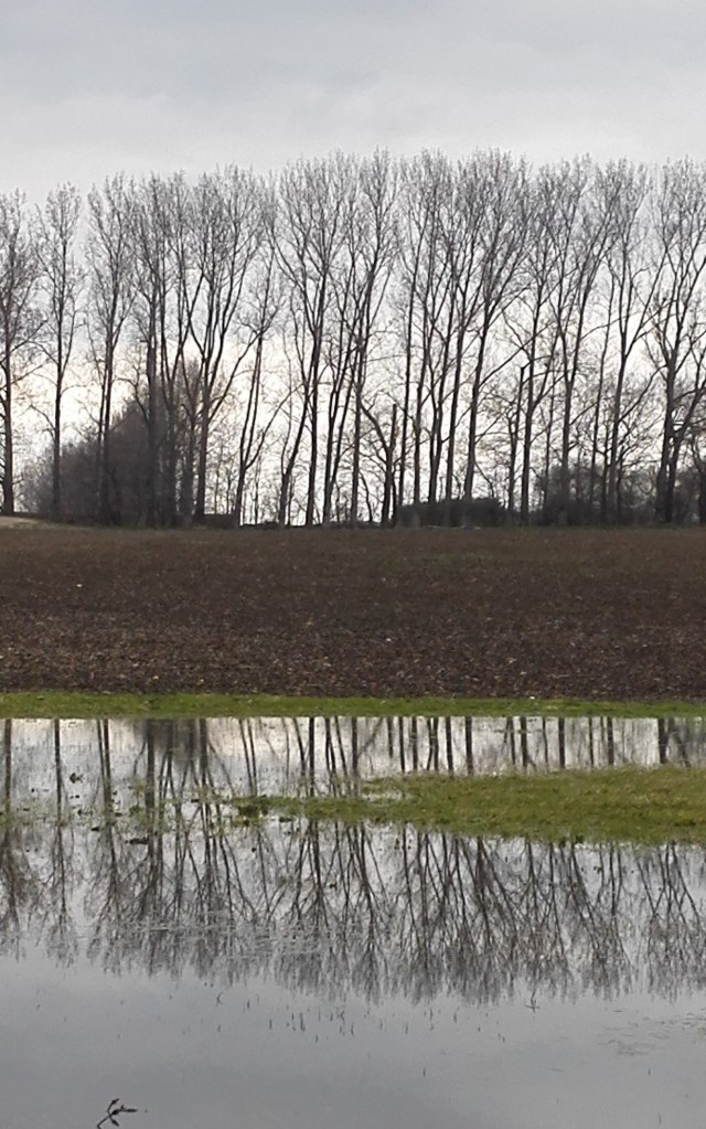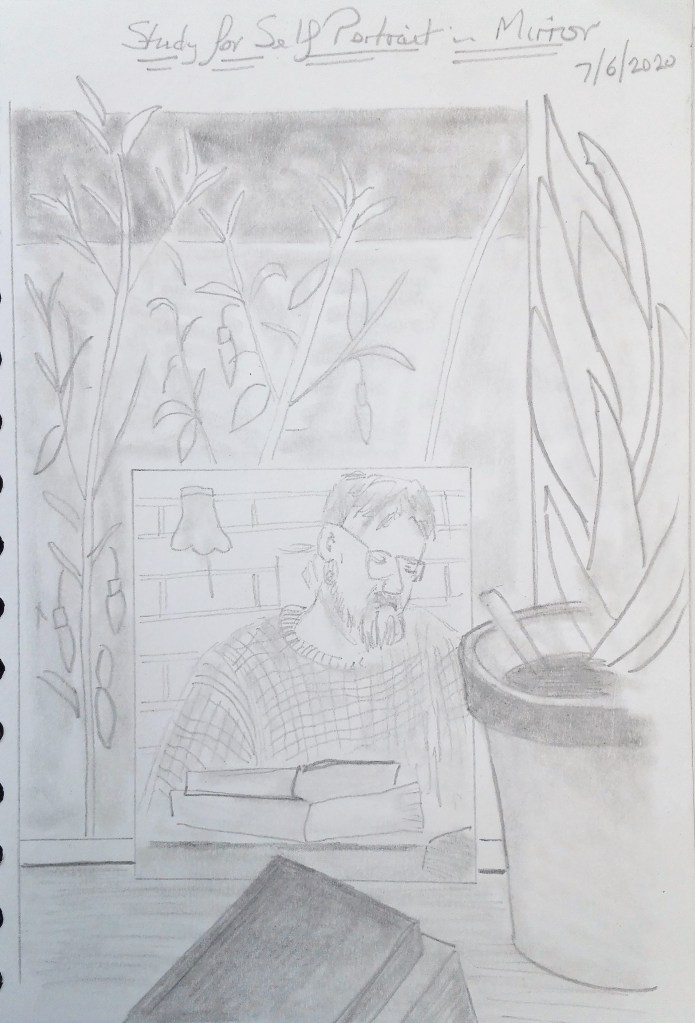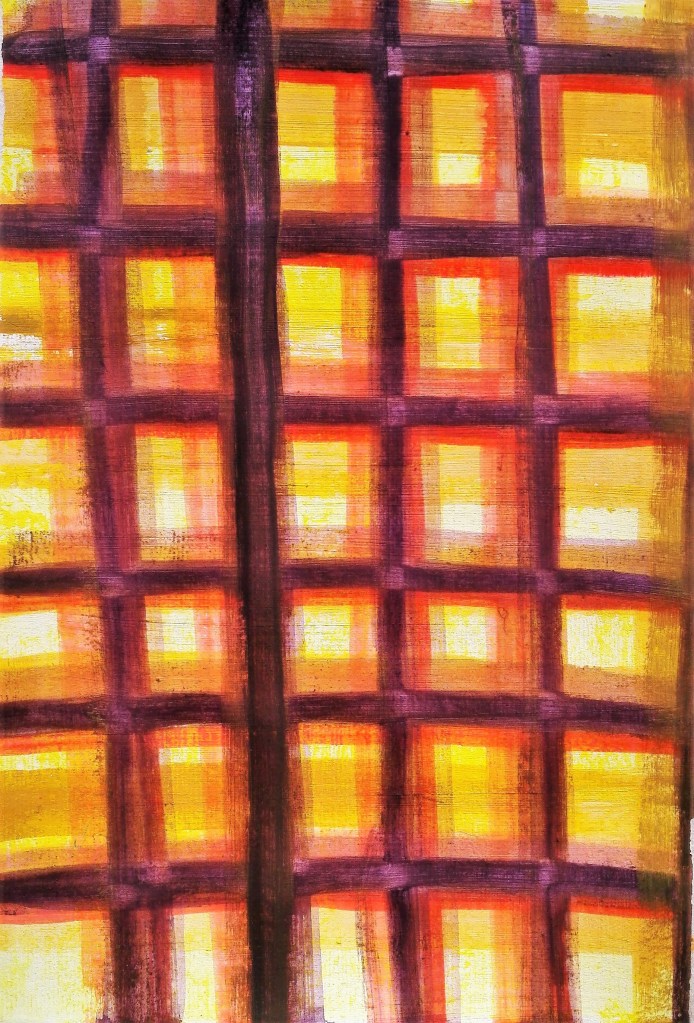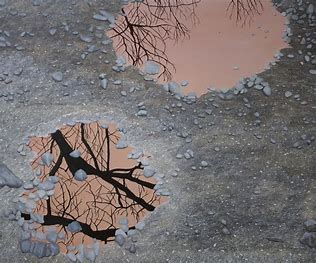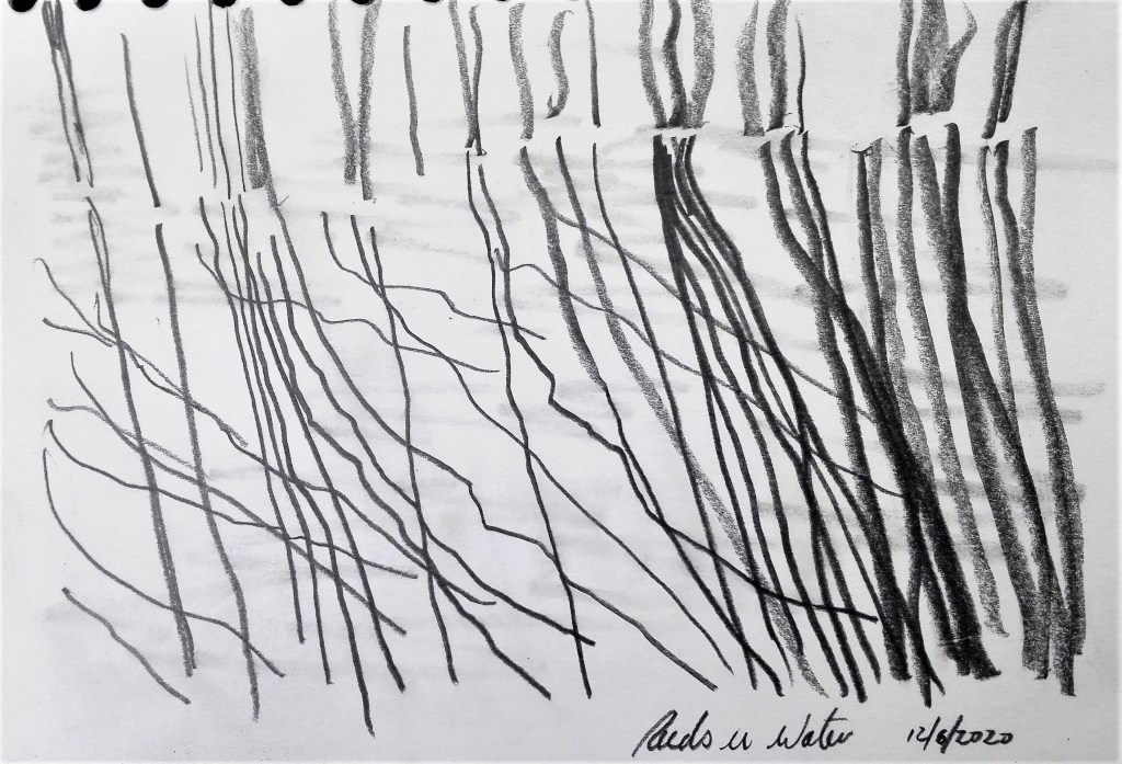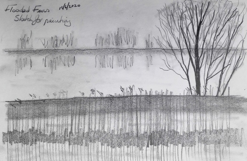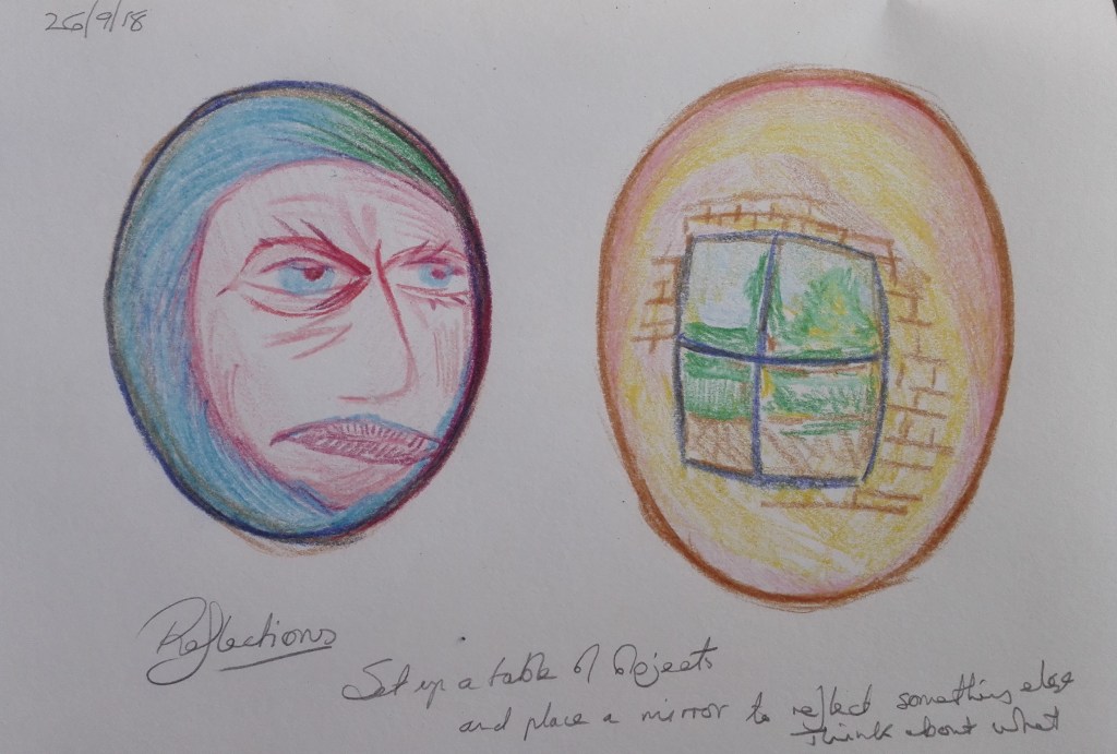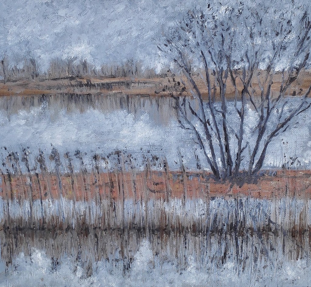 Of the exercises it was Exercise 1.4 ‘ The mirror as a stage’ which I was best able to respond to. This wasn’t a surprise to me as the topic of reflections is an area that I have explored before. It also aligns closely with my Fenland landscape paintings where water acts as both a reflective surface and a mirror. Unsurprisingly, to me, I created six paintings exploring aspects of this topic and I also went on to to complete a further work for my Assignment Three piece.