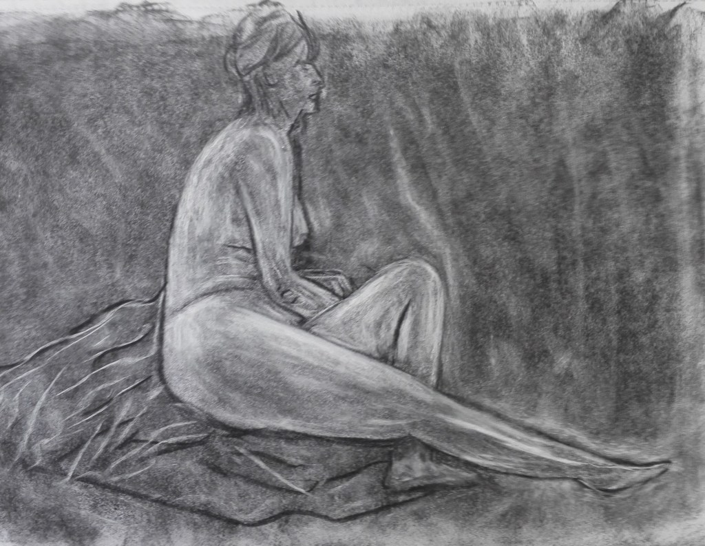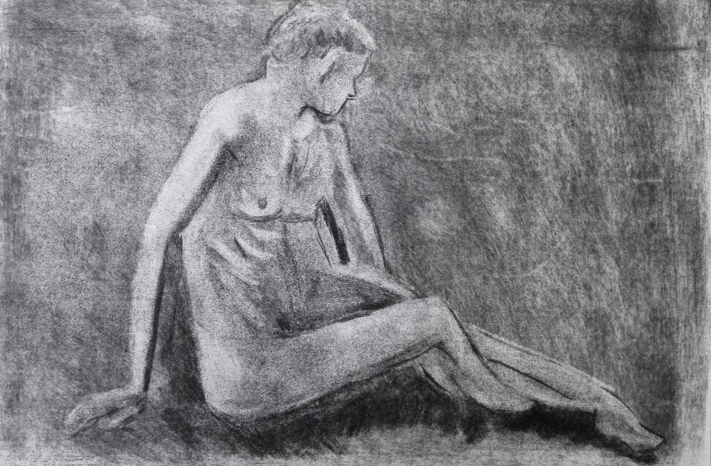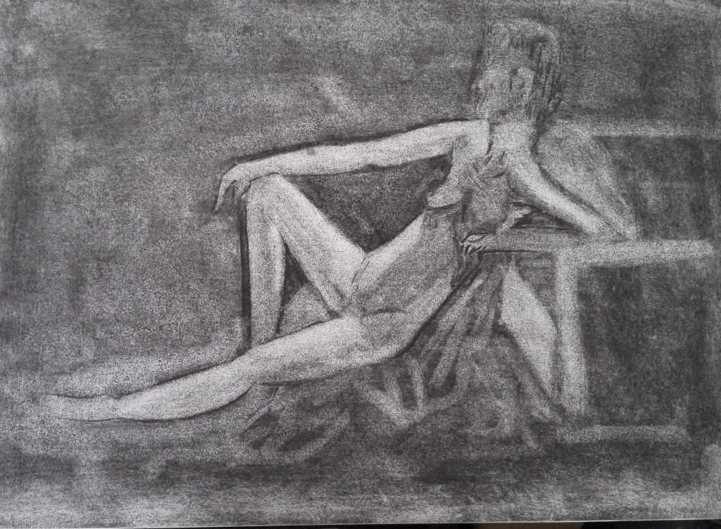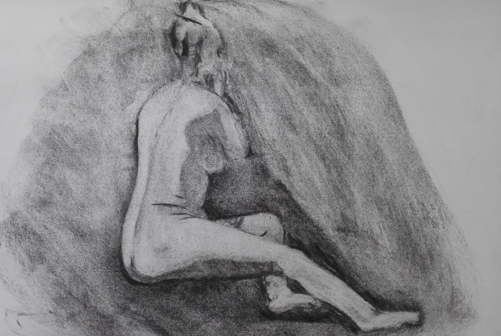 I tried to some new techniques primarily one whereby I cover the paper in charcoal and work by removing the charcoal with a rubber to reveal the tones and outlines. There are a couple of drawing where I feel that this has been successful. The confines of the room and the short length of the poses prevents me from using paint but I do want to start to introduce some colour into my drawings. This will be with chalk and or oil pastels. I will experiment with these during the Spring term which starts after Easter.