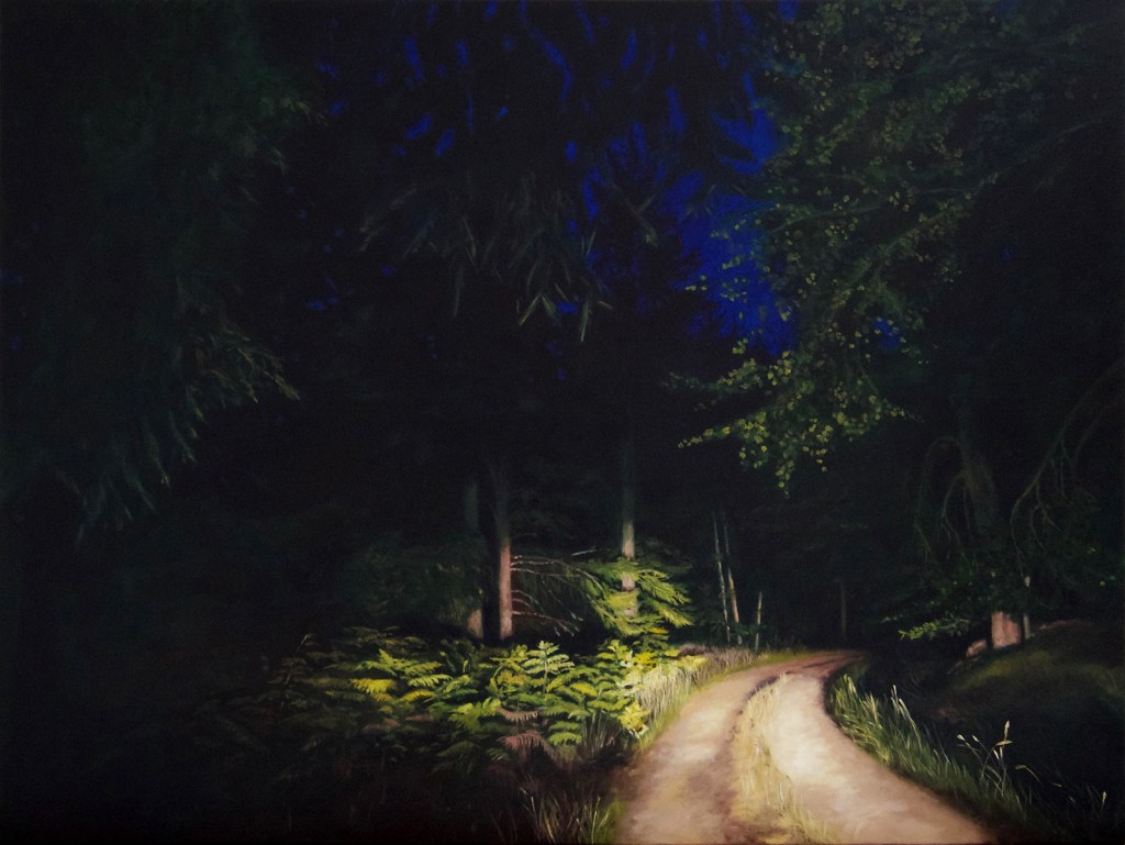 This painting very much resonates with my own practice. There are similarities in topic, composition, style and technique. In Judith’s painting we are shown what looks to be a holiday home, a chalet, perhaps situated neat to the coast. It is late, maybe the middle of the night, the chalet has a ghostly appearance hovering in the half light. There are shadows all around the building and there is no light emanating from it. All is quiet. What happens here, what has happened here? Nothing is revealed it is left to our imagination. The whole scene and the storytelling is supported by the cryptic title ‘I only come here when the weathers good’