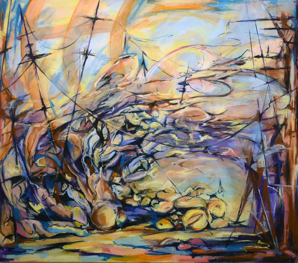 I was drawn to this abstract painting due to it’s similarity to the paintings of Mark Rothko. The Seagram murals by Rothko at Tate Modern, where I have spent much time looking at the paintings, are brought to mind. Once you relax in front of these paintings and allow the mind to wander a myriad of shapes and forms play across the canvas. Obviously the painting above by Ruth Philo doesn’t have the grandeur of the Seagram Murals as it is only 30 x 30 cms but perhaps it represents a small section. I am also reminded of an abstract painting of mine which has a similar quality. I have also now given this painting an ambiguous title.