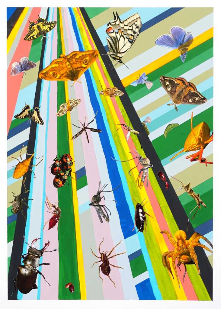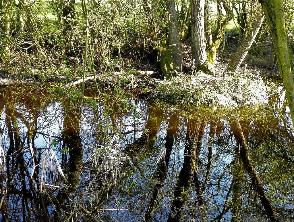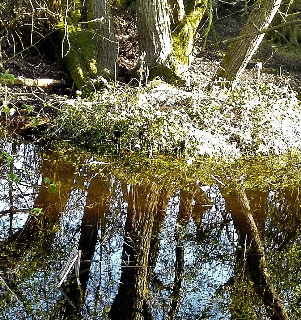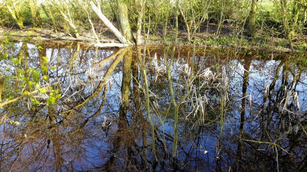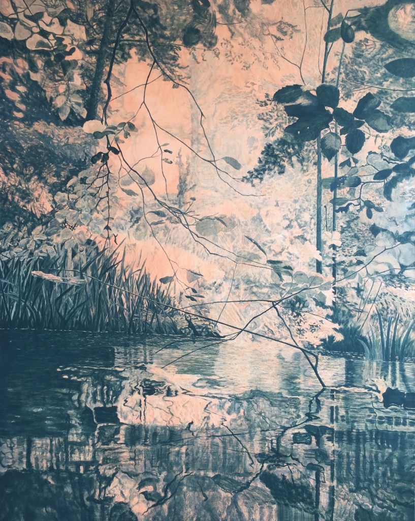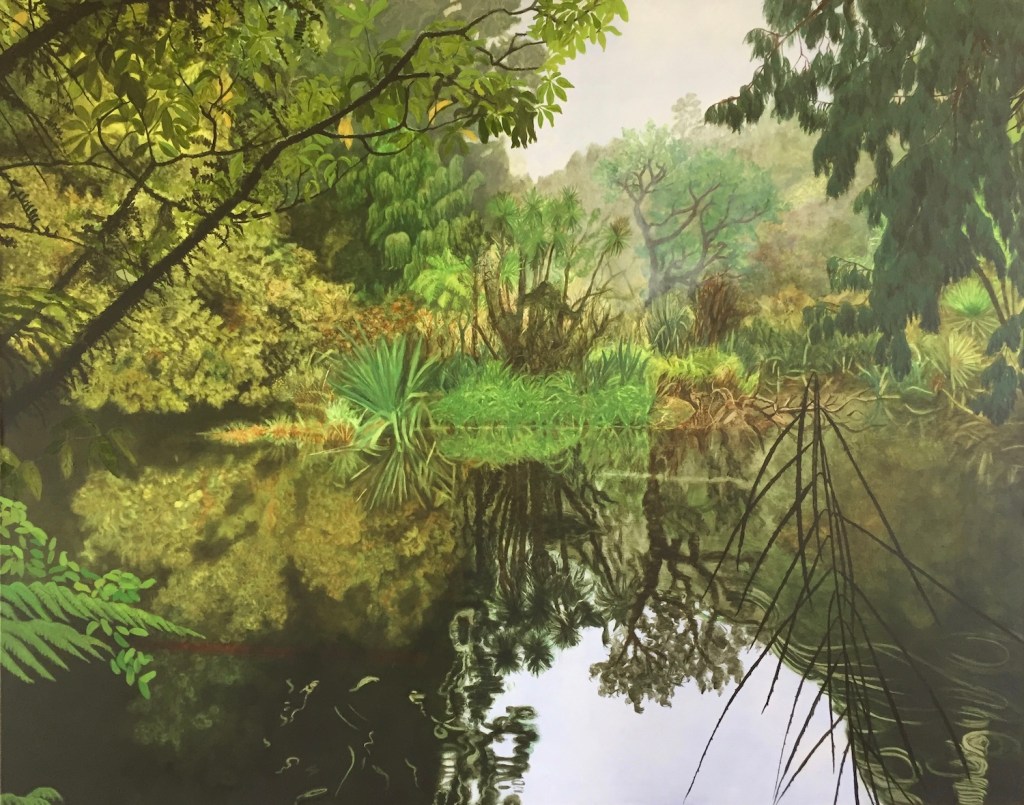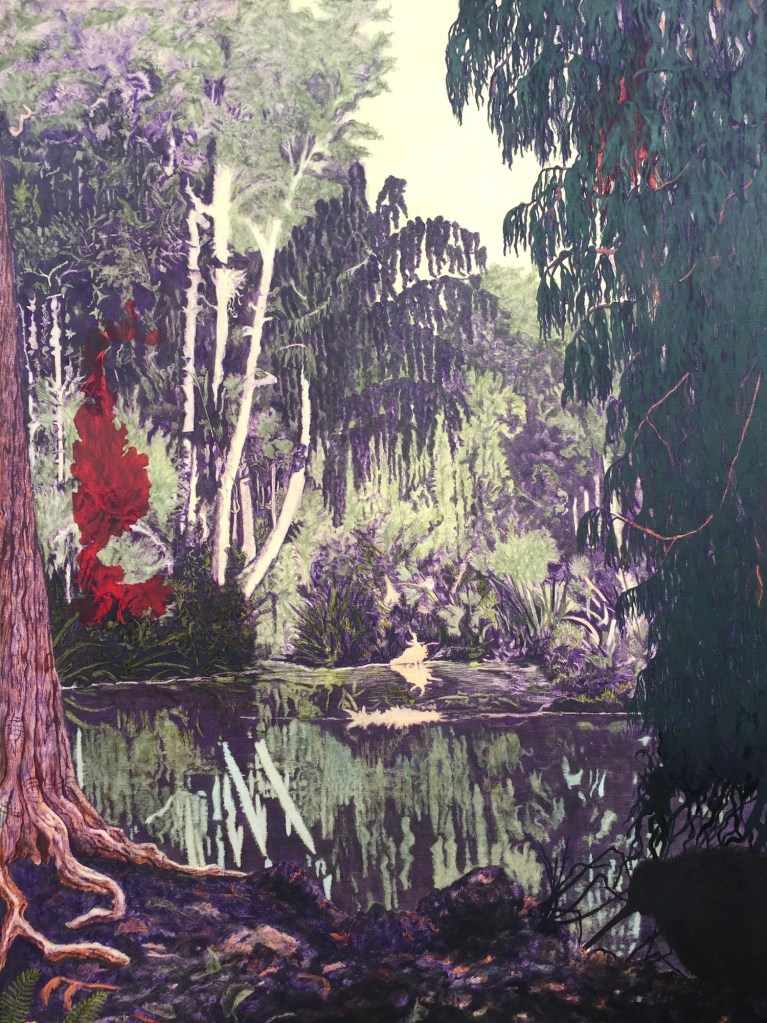The water is flowing beneath the grid that our feet we are standing on. The colour pebbles and fish flicker against the river bed and the vegetation. This is what I see when I look at this painting. Was this the intention of the artist, I don’t know.