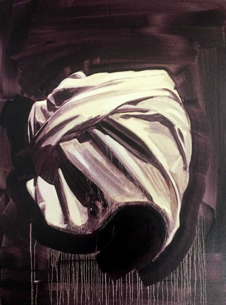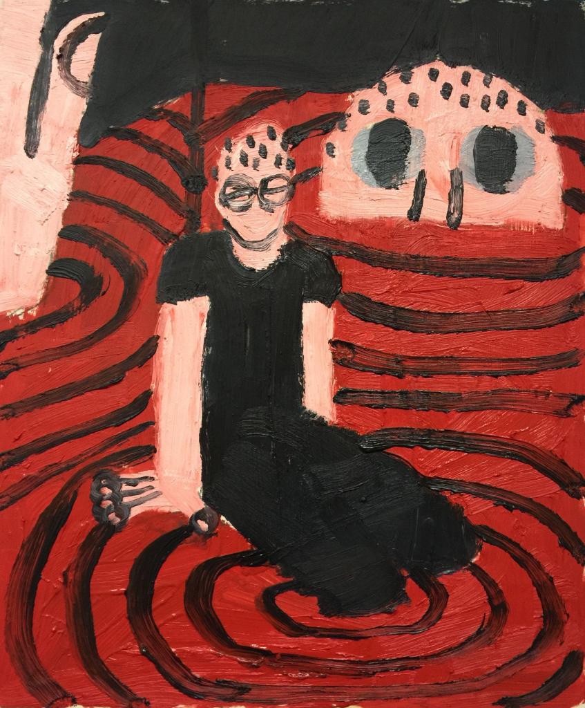 The key to this painting is in its title where it references Pussy Riot the Russian feminist protest punk rock and performance art group. The groups membership has always been numerous and changeable making the individuals members of less importance. They are often photographed wearing knitted balaclavas to hid their identities. Wendy Saunders painting uses this anomality to great effect, the simple figure is featureless, the pose is threatening and the colours bold and challenging.