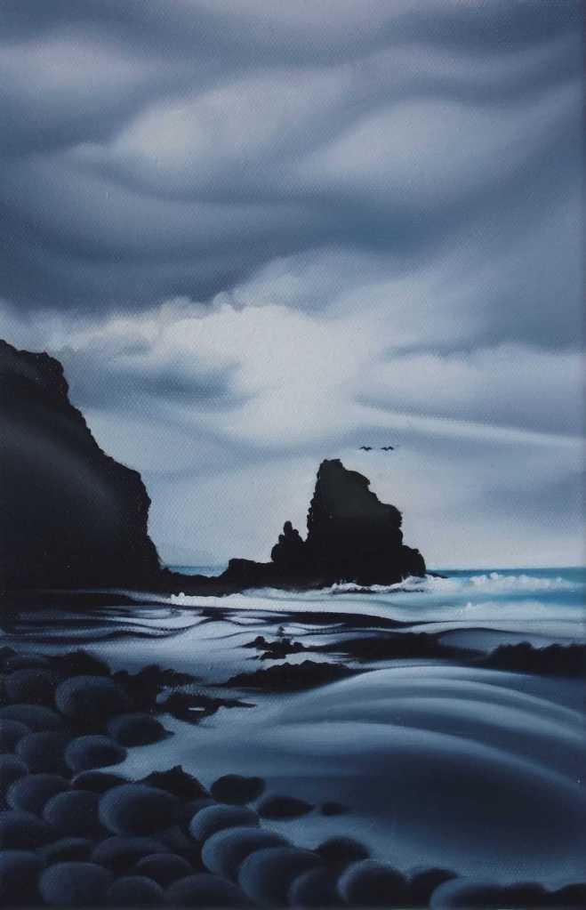 A moving, as in the movement of the subject, study of the sea making landfall. It is not a particularly rough sea just a typical series of waves meeting what I suspect is a pebbled beach. The foreground is all foamy, bubbling whiteness, the middle ground is the sea taking breath in readiness for the next wave which can be seen forming just behind it, this leads to the choppy sea behind and in the background a thin line of distant sky. The whole scene is wonderfully observed and meticulously painted.