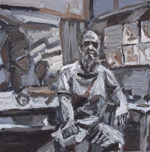 With a minimal palette of colour, basically blue and red on a white background, the paint has been loosely scrapped and applied in layers to build up a haunting image. The figure emanates from intense gazing eyes that draw you towards the face. It is only when you manage to look away from the eyes and head that you notice that the body supporting it is really not there.