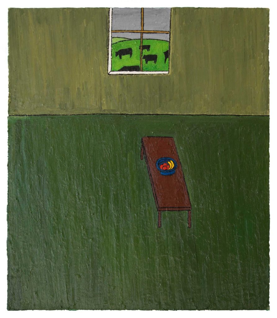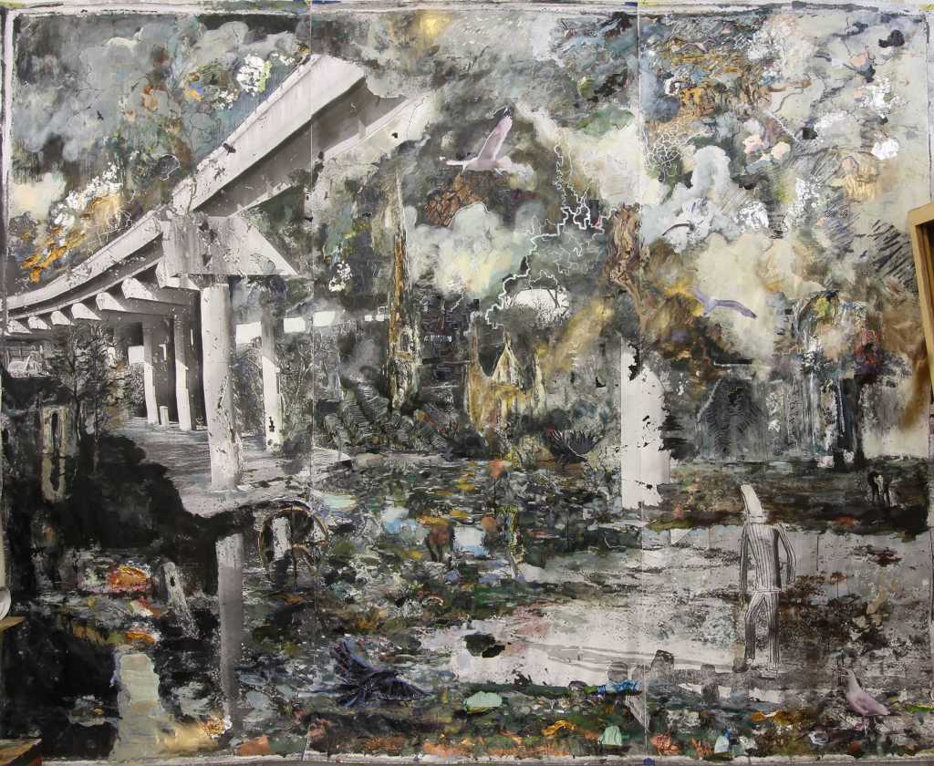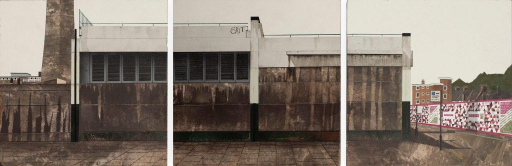 This painting immediately resonates with me as there are numerous links to my own practice and subjects matters. The painting depicts a row of run down shop fronts which are all part of a decaying building. There are shrubs growing out of the brickwork, the windows are either smashed or boarded up and the shop fronts are covered by shutters some of which carry graffiti. The scene is depicted under on ominous looking leaden sky. To top it all there is a direct reference to the political and social economic situation in which the scene exists as the title of the painting is ‘All the riches of Britain’.