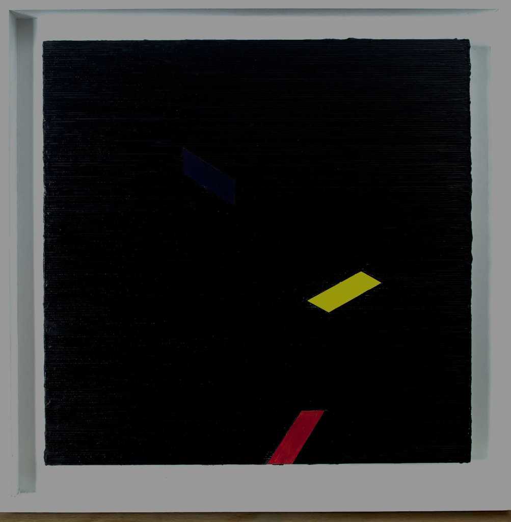 When I was selecting this painting I recall that is was one of a series of works that in concept and appearance were similar to each other. All the paintings are on square canvas’s which are divided into straight lined rectangles, square and L shapes. The blocks are painted in single colours consisting of, toned down, red, orange, black and grey and the dividing lines are left white. The overriding link between the paintings is partially in common title ‘Utah’ and the homage that they pay to the paintings and ideas of Piet Mondrian.