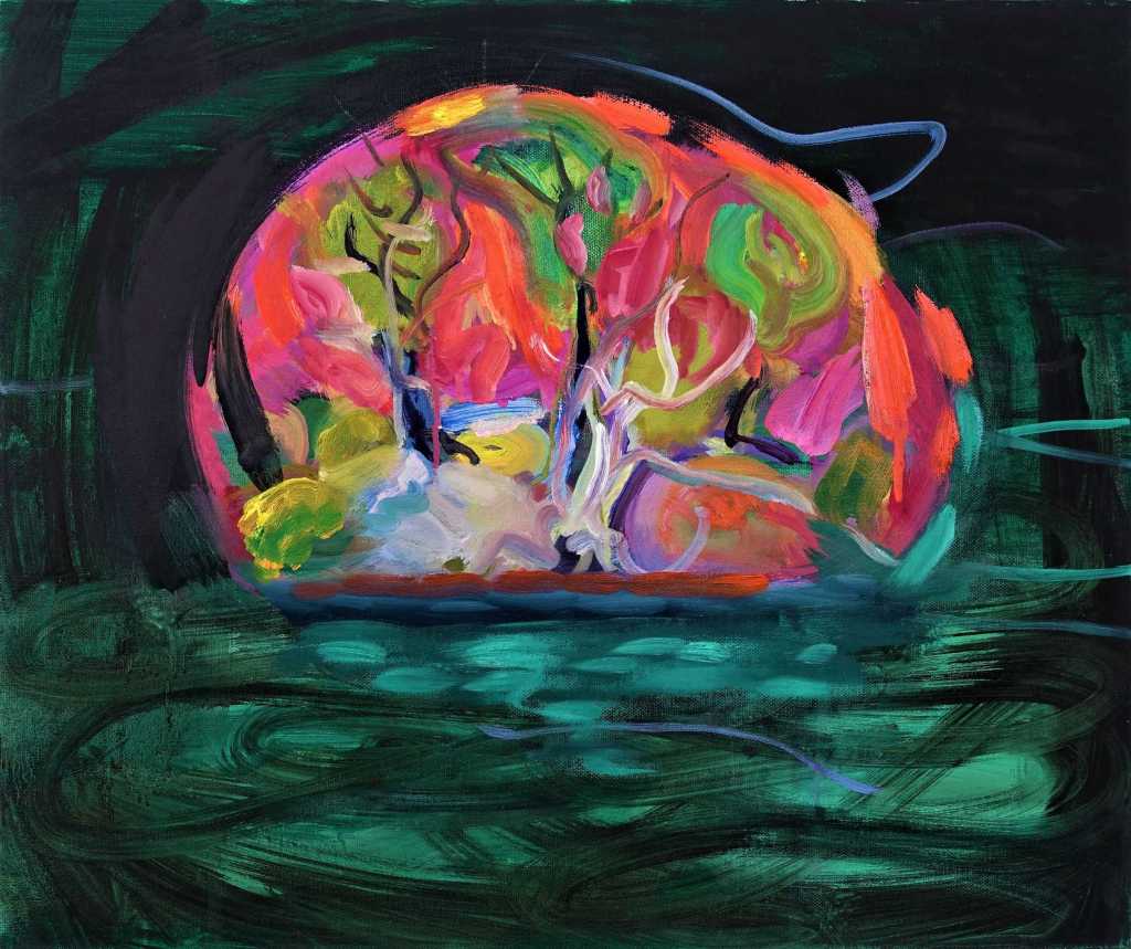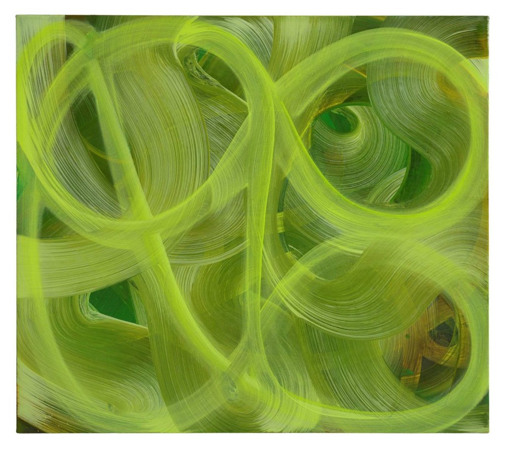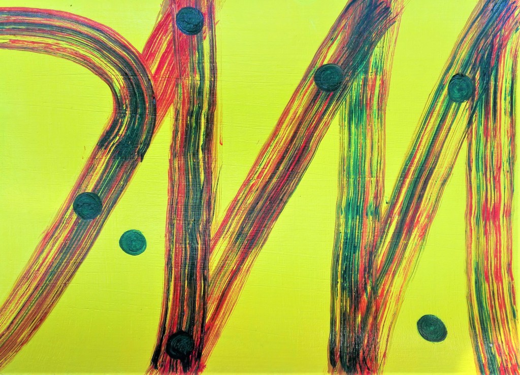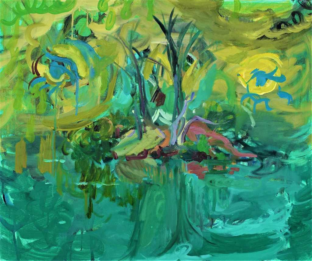 The water is flowing beneath the grid that our feet we are standing on. The colour pebbles and fish flicker against the river bed and the vegetation. This is what I see when I look at this painting. Was this the intention of the artist, I don’t know.