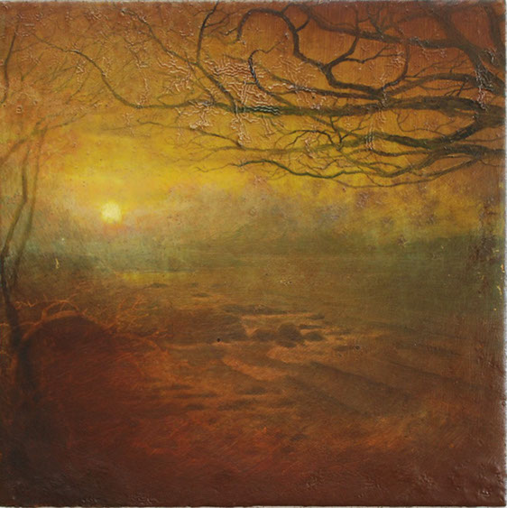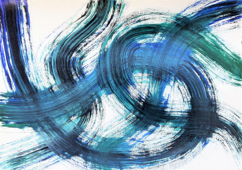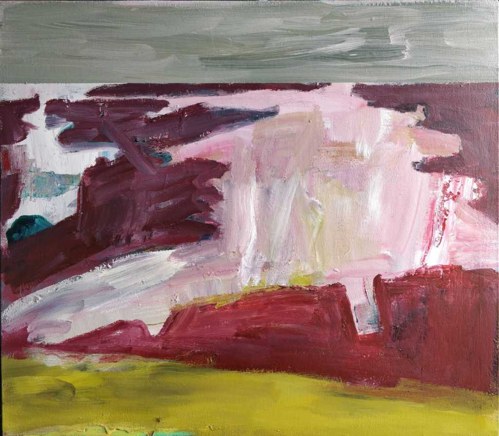 I was drawn to this abstract painting due to it’s similarity to the paintings of Mark Rothko. The Seagram murals by Rothko at Tate Modern, where I have spent much time looking at the paintings, are brought to mind. Once you relax in front of these paintings and allow the mind to wander a myriad of shapes and forms play across the canvas. Obviously the painting above by Ruth Philo doesn’t have the grandeur of the Seagram Murals as it is only 30 x 30 cms but perhaps it represents a small section. I am also reminded of an abstract painting of mine which has a similar quality. I have also now given this painting an ambiguous title.