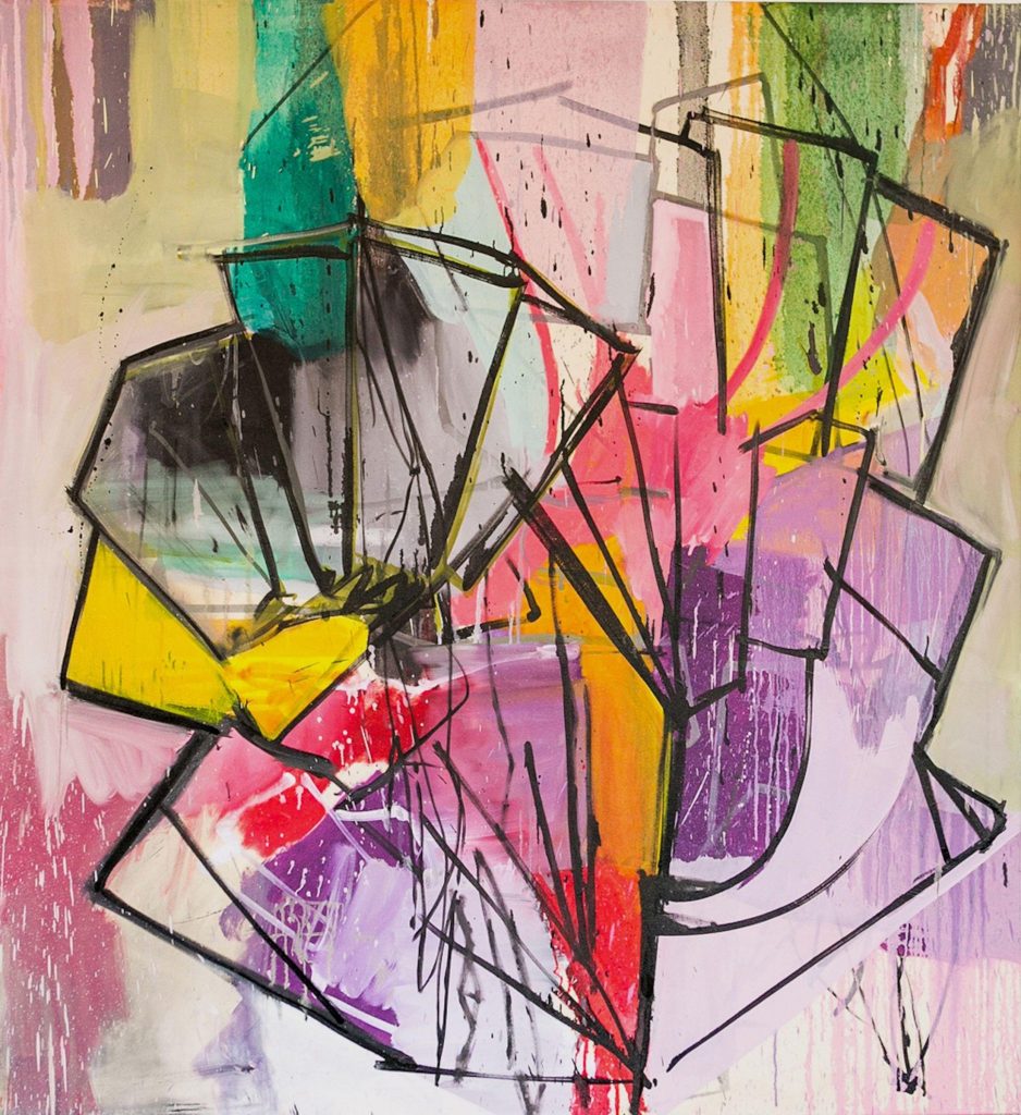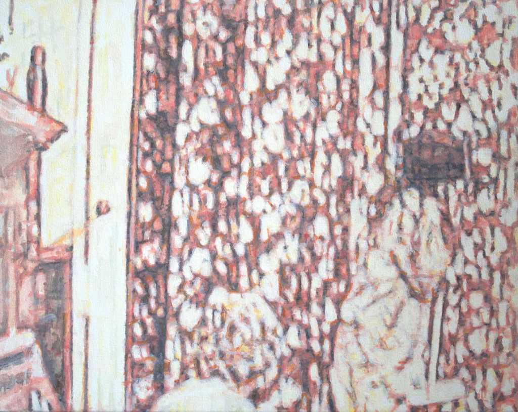 This painting could almost be an advertising photograph for a new housing estate. It is a tour de force in linear perspective coupled with photo-realism but, for me, lacks feeling, it feels cold. The intricate work that has been completed, especially on the scaffolding, has been painstakingly rendered and I suspect took the artist many hours to complete. The title adds an air of intrigue ‘ It Haunts It’ as it raises a question as to what is haunting what? To my mind it is the idealistic, ‘artists impression’, of the housing development which sits in front of the building work which is challenging the builders to replicate it. I also imagine a quiz question asking the where the hoarding is located.