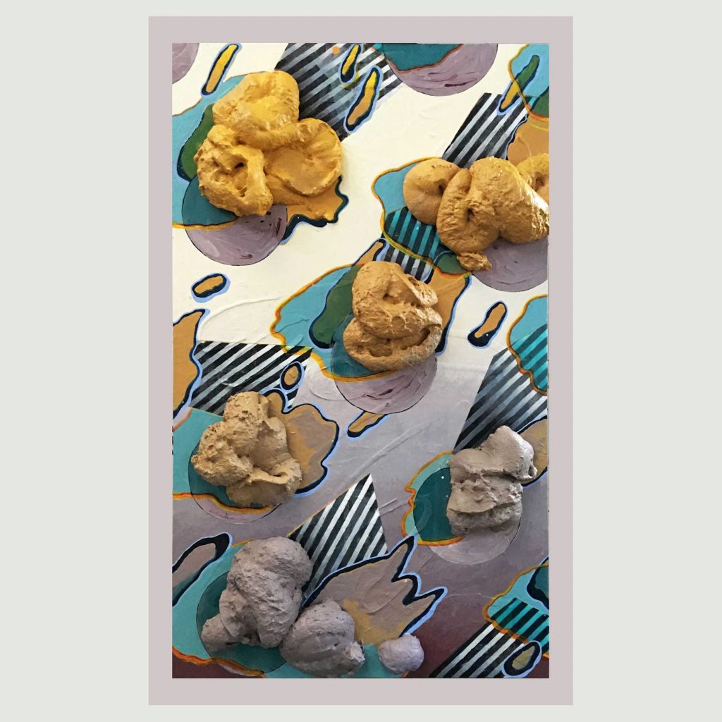 This painting is much harder to read than the previous ones. I struggle to get past the literal interpretation of what I see. It is a near photorealistic painting of two wall tiles, one pale orange the other speckled grey, which have been presented to us partially framed and displayed on a white wall. The tiles have broken edges which the orange tile casts a shadow which although realistic doesn’t follow the contour of the broken edge. I guess that there is a clue to the work contained in the idiosyncratic title but it passes me by.