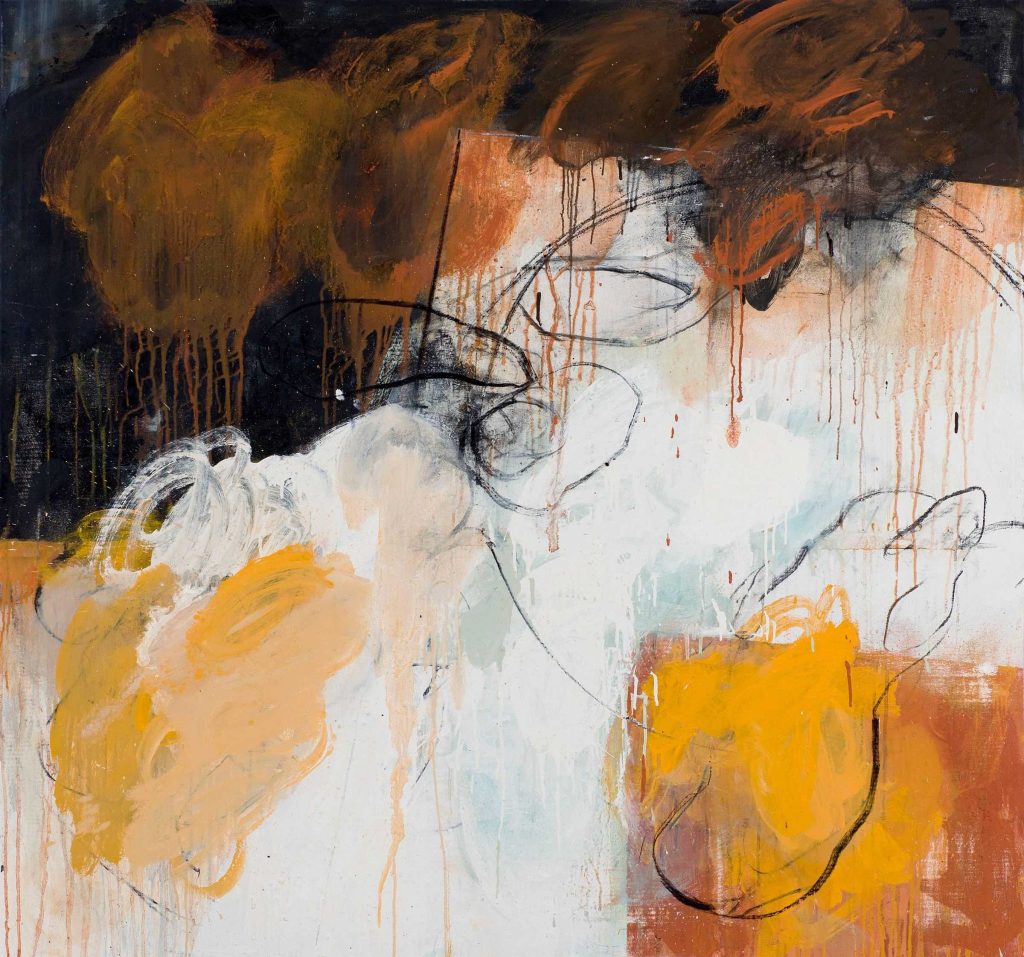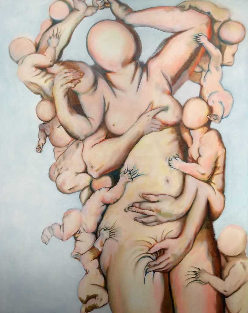 In the year of Covid 19 this painting takes on a poignant significance. I note that it was completed in 2019 and therefore could act as a prediction. However it is more likely to reference a conflict or conflicts in general where the outcome has not been good. The male figure digs the graves whilst a woman looks on. The soil is thin and sandy, orangey red in colour and the background bleak with leafless trees. The title hints at the circle of life returning the bodies to whence they came.